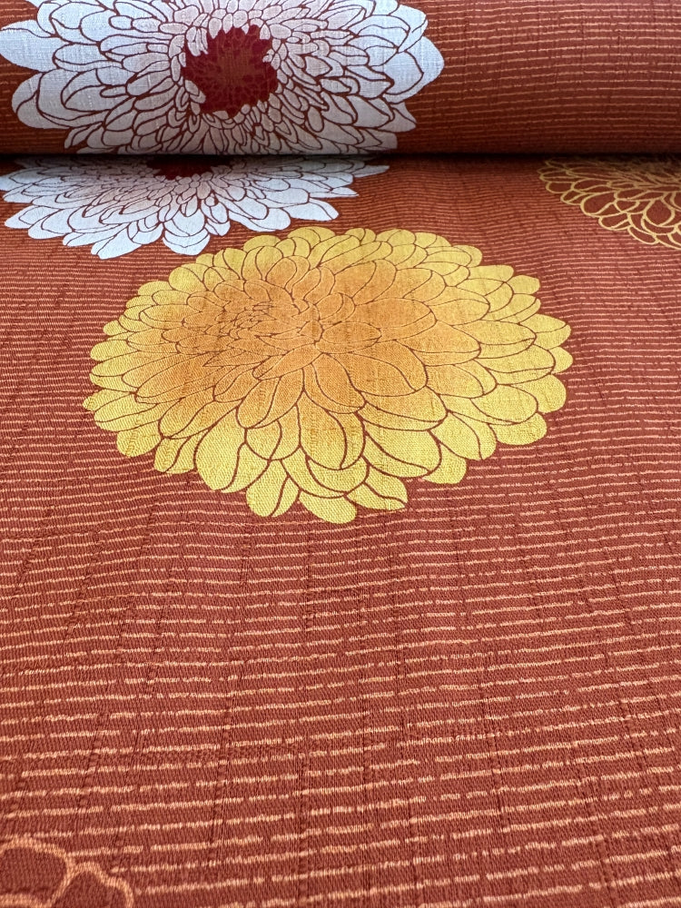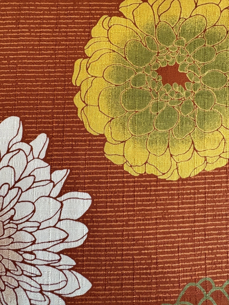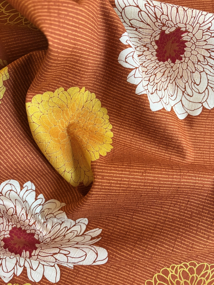 Dieser wunderschöne Baumwoll-Stoff von Kobayashi hat eine gewebte Leinenstruktur und ist mit seidenglänzenden Dahlien und zarten Streifen bedruckt. Er ist sehr gut geeignet für Kleider, Röcke, Blusen und Hemden. Aber auch für stilvolle Accessoires, Kissen, Vorhänge und festliche Tischdecken.