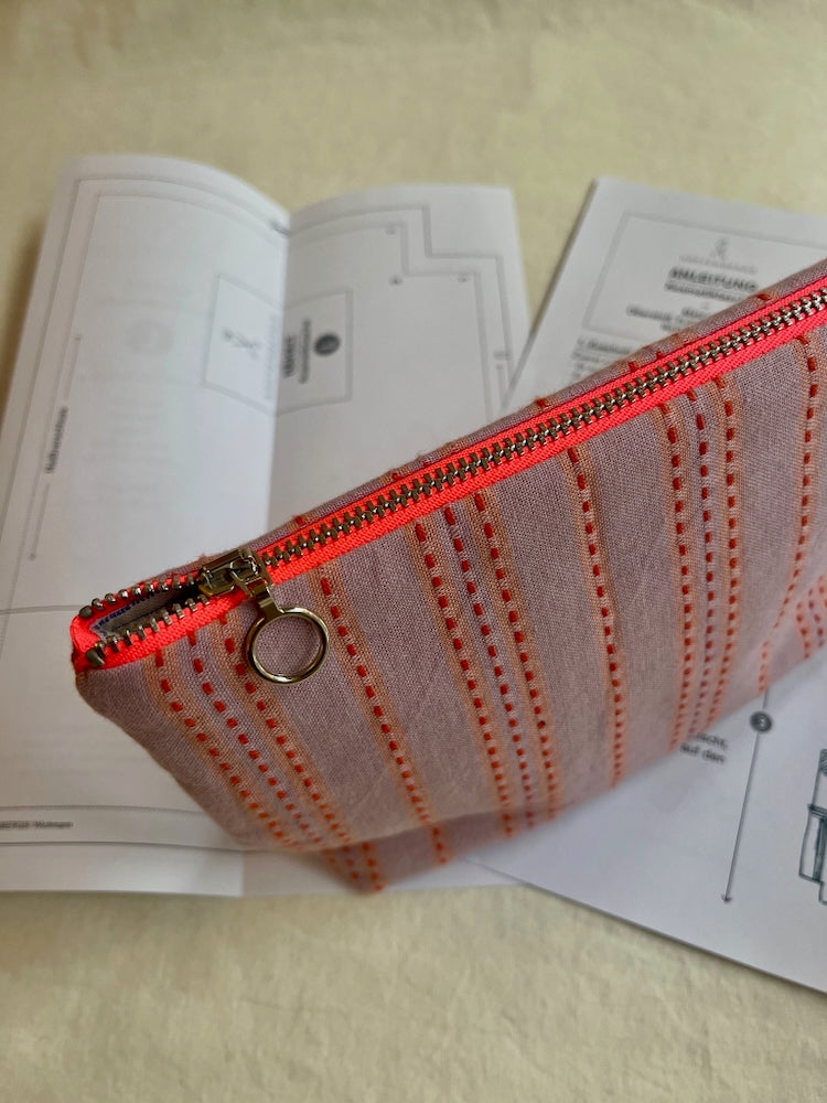 Das Nähkit enthält das Material für eine Kosmetiktasche der Größe L. Für mutige Nähanfänger*innen geeignet!