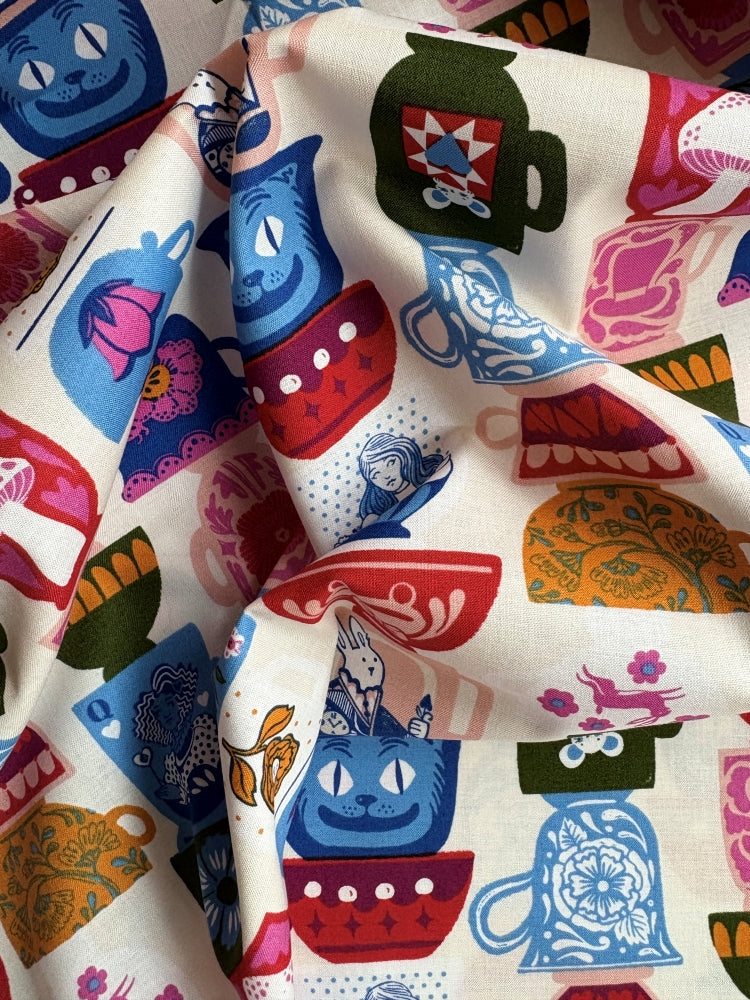 Tee trinken mit Alice im Wunderland! Ein wunderschöner leichter Baumwollstoff, perfekt geeignet für Patchwork, Kissen, Täschchen, aber auch Kleidung wie Blusen und Kleider. Aus der Ruby Star Collection von Sarah Watts.