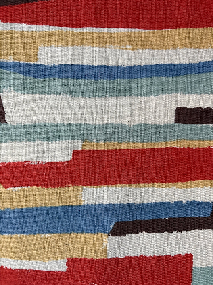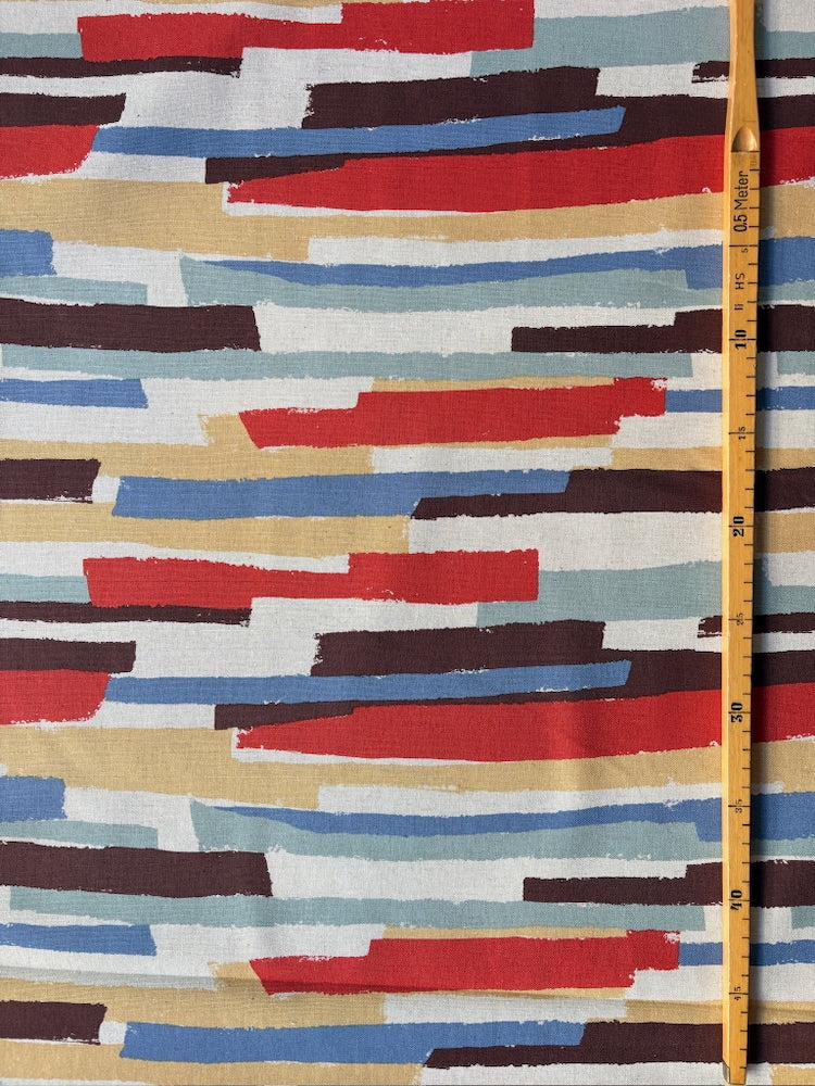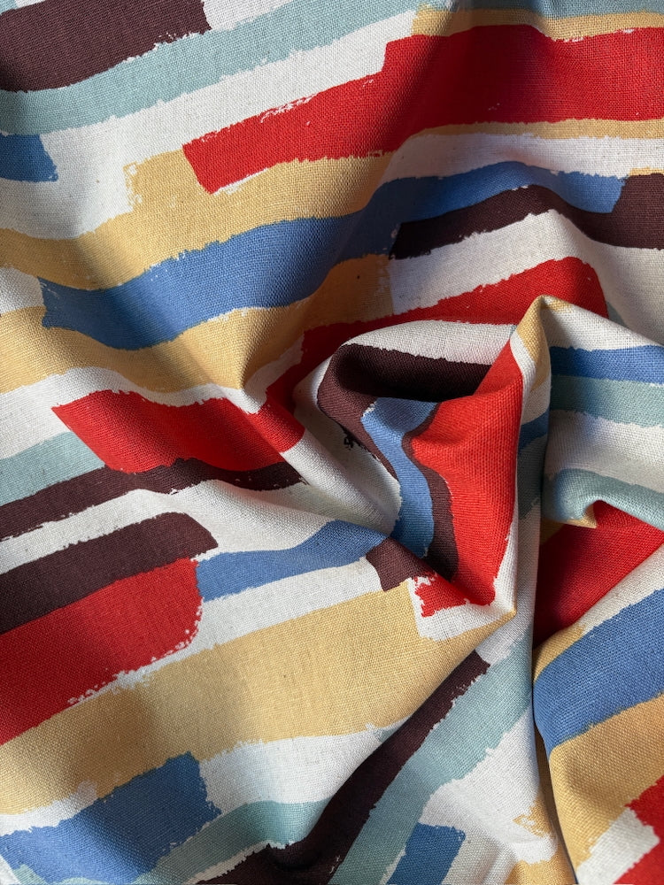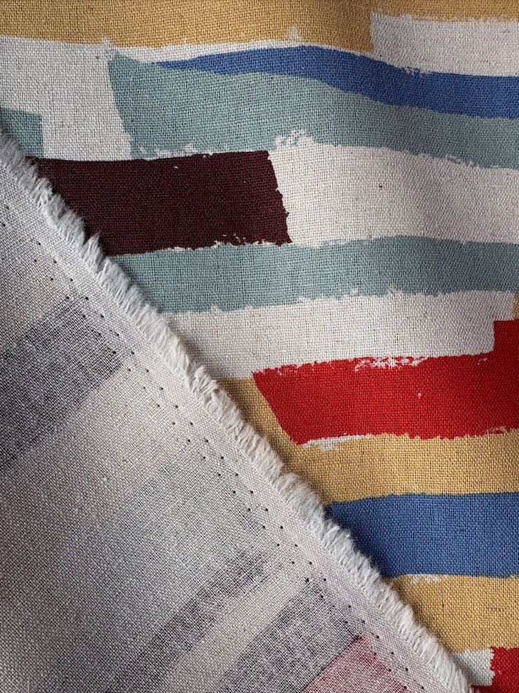Dieser wunderschöne feste Leinen-Baumwoll-Canvas von Kokka ist bedruckt mit unregelmäßigen Blockstreifen. Perfekt geeignet für Taschen und Accessoires, wie Kissen, Tischdecken oder Schürzen, aber auch für farbenfrohe Röcke, Hemden oder Kleider.