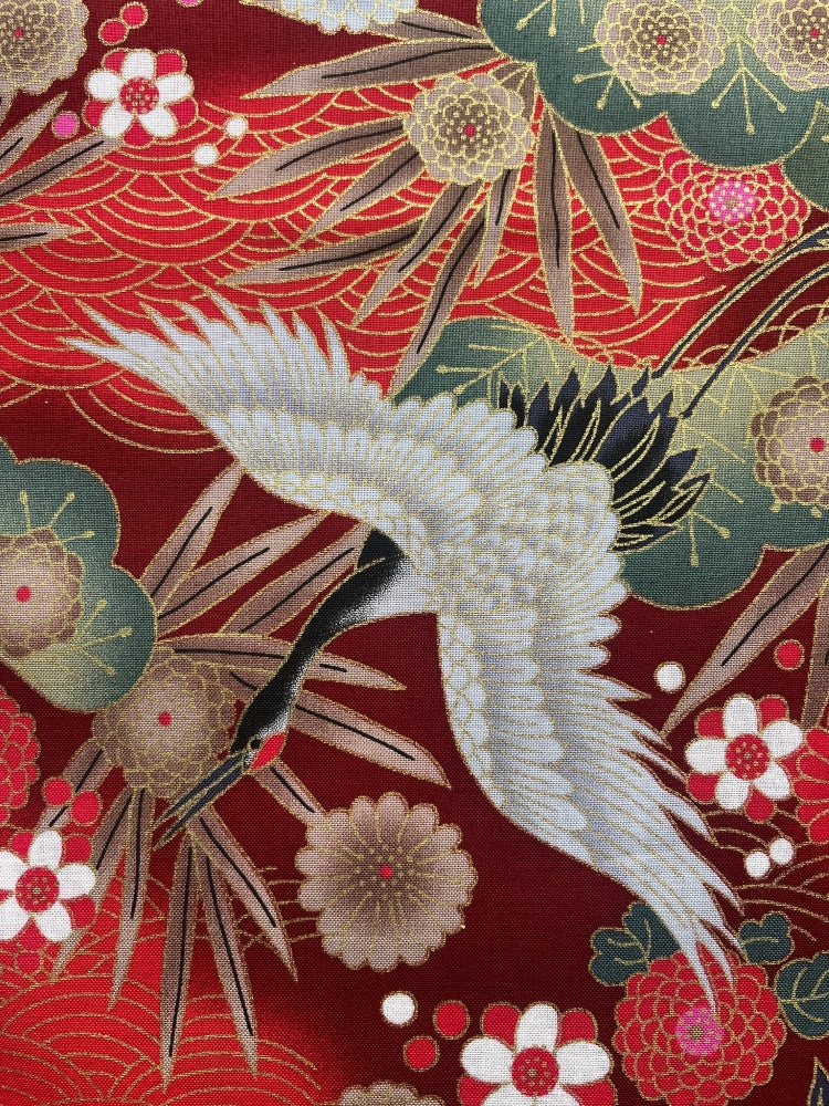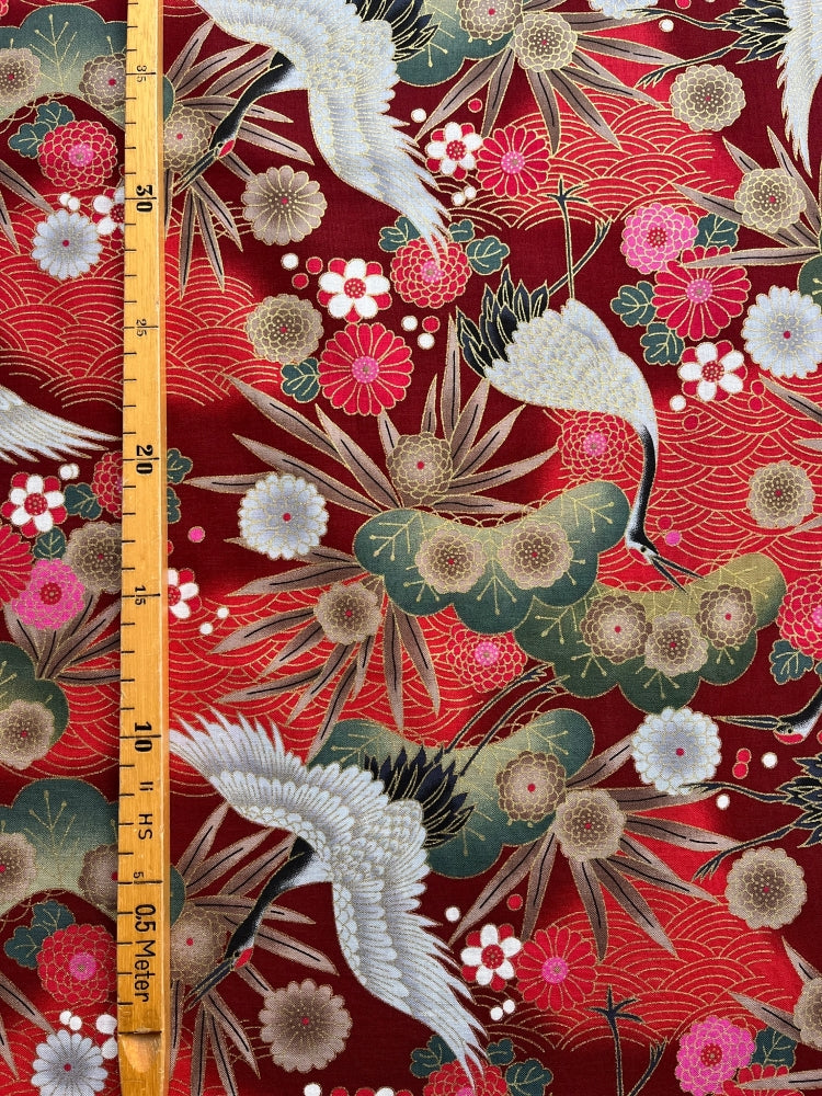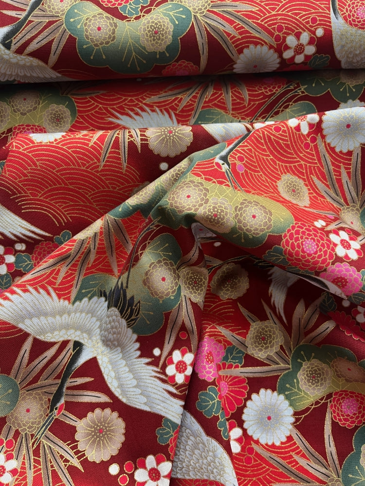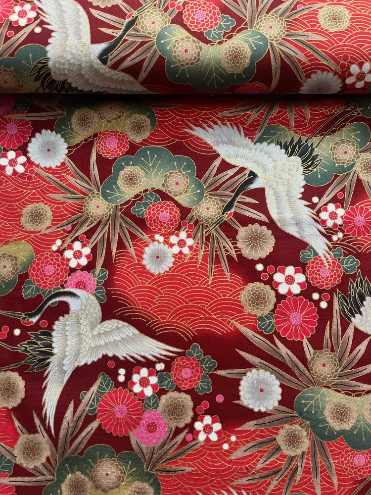 Wunderschöner bedruckter Baumwollstoff mit großen fliegenden Kranichen, Chrysanthemen und Seigeiha - goldumrandet auf rotem Grund. Dieser glatte Baumwollstoff ist perfekt geeignet für Kimonos, Kissen, Turnbeutel und kleine Täschchen. Aber natürlich ein echter Hingucker, wenn fliegende Kraniche Blusen, Kleider und Röcke zieren dürfen.