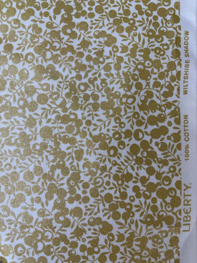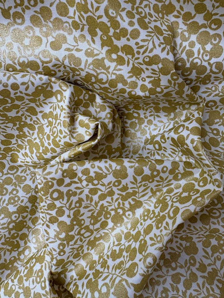 Ein wunderschöner Gold-Druck aus der Whiltshire Collection von Liberty London. Der feine, hochwertige Baumwollstoff (Lasenby-Baumwolle) ist sehr gut geeignet für festliche Blusen und Hemden, aber auch für kleine Accessoires wie Täschchen oder Kissenbezüge und jegliche Quilting-Projekte.