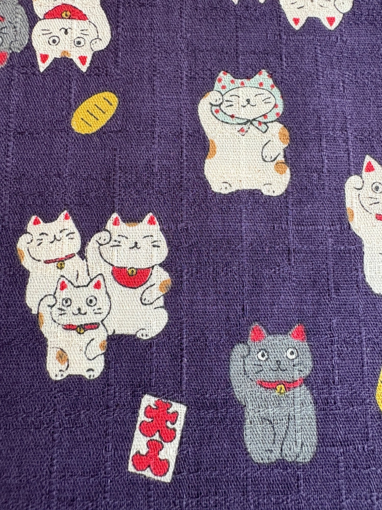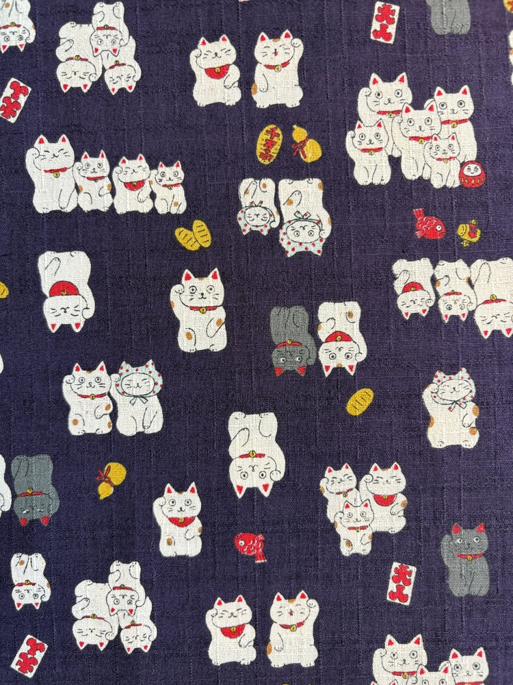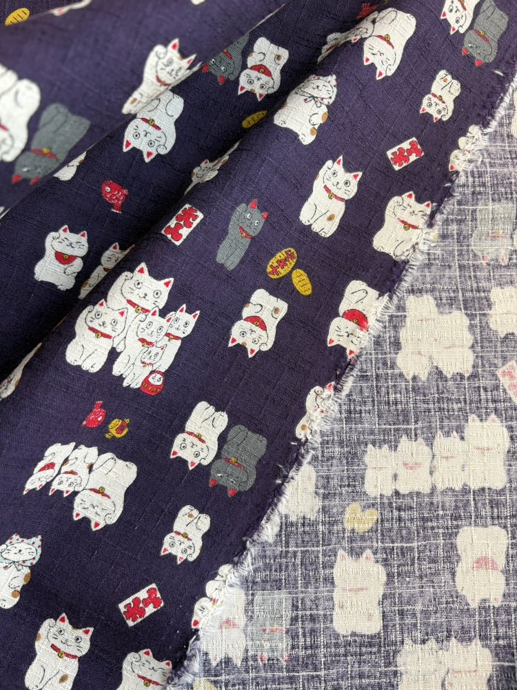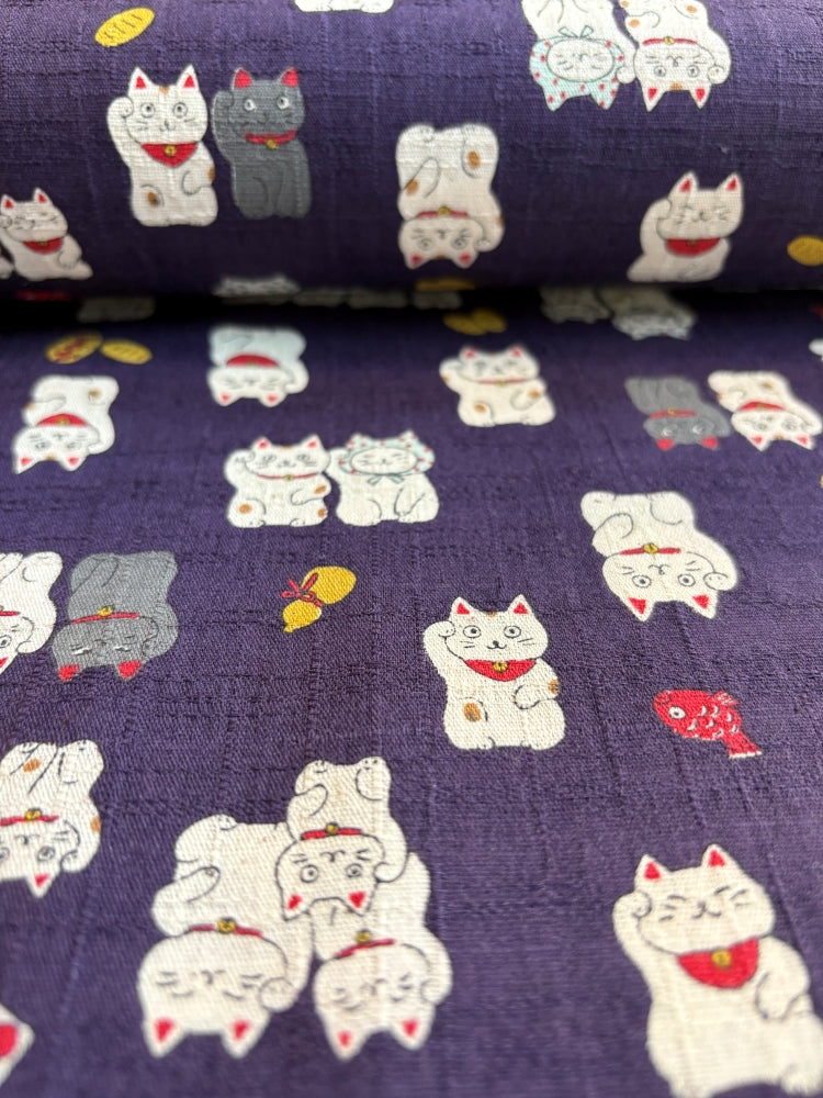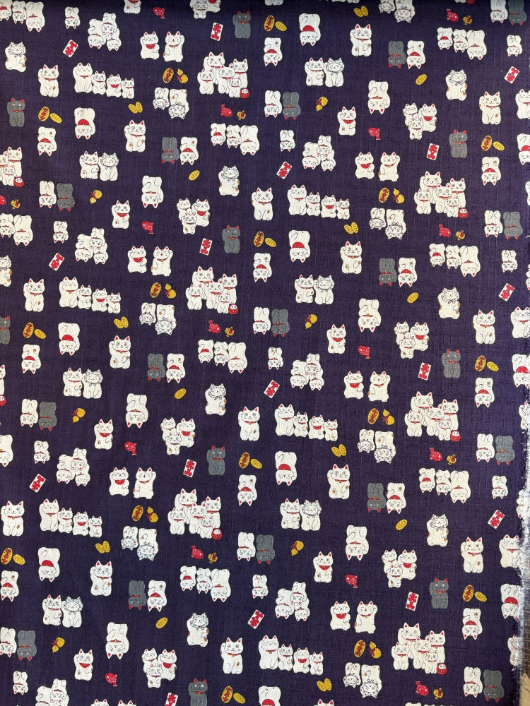 Dieser wunderschöne Baumwollstoff mit gewebter Leinenoptik ist bedruckt mit Maneki Neko: Die Winkekatze ist ein traditioneller japanischer Glücksbringer, der Wohlstand und Glück anziehen soll. Sehr gut geeignet für Kimonos und andere Kleidungsstücke, aber auch für Taschen, Kissen und schöne Dinge für Haus & Hof. Und natürlich perfekt für Glück bringende Geschenke!